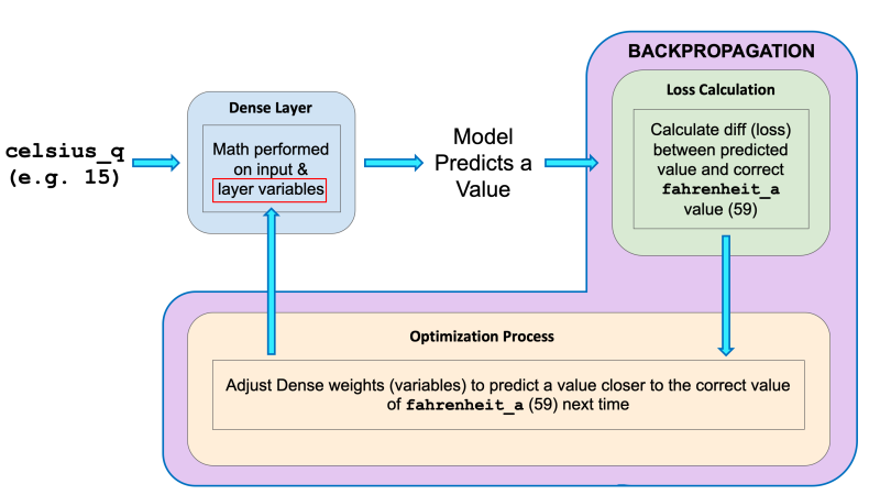 For example, in the Celsius to Fahrenheit conversion problem, the model starts by multiplying the input by some number (the weight) and adding another number (the bias). Training the model involves finding the right values for these variables, not changing from multiplication and addition to some other operation.